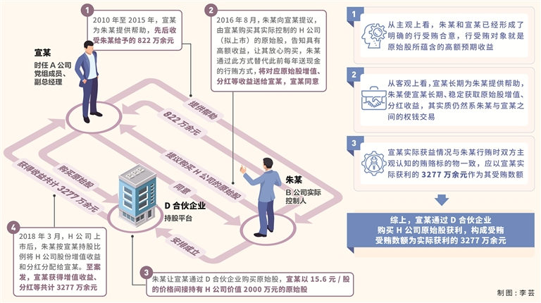 其中,2010年至2015年,宣某為B公司原料供應(yīng)業(yè)務(wù)提供幫助,先后11次收受B公司實(shí)際控制人朱某給予的100萬(wàn)美元、20萬(wàn)歐元,折合共計(jì)822萬(wàn)余元。2016年8月,朱某向宣某提議,由宣某購(gòu)買其實(shí)際控制的H公司(擬上市)的原始股,告知其公司上市后原始股將有3到5倍增值,并有高額分紅,讓其放心購(gòu)買。朱某擬通過(guò)此方式將對(duì)應(yīng)原始股增值、分紅等收益送給宣某,替代此前每年送現(xiàn)金的行賄方式,宣某表示同意。朱某安排成立了D合伙企業(yè)作為持股平臺(tái),讓宣某等多名國(guó)家工作人員(另案處理)通過(guò)D合伙企業(yè)購(gòu)買原始股。宣某以15.6元/股的價(jià)格,通過(guò)D合伙企業(yè)間接持有H公司價(jià)值2000萬(wàn)元的原始股。2018年3月,H公司上市后,D合伙企業(yè)陸續(xù)減持H公司的股份,朱某將增值收益、H公司分紅按宣某持股比例分配給宣某。至案發(fā)時(shí),股份已陸續(xù)全部售出,扣除本金后,宣某獲得增值、分紅等收益共計(jì)3277萬(wàn)余元。