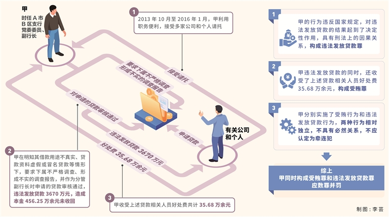 我們認(rèn)為,對于甲收受好處并違法發(fā)放貸款的行為,應(yīng)當(dāng)以受賄罪與違法發(fā)放貸款罪數(shù)罪并罰。一是甲分別實(shí)施了受賄行為和違法發(fā)放貸款行為,通常情況下,銀行工作人員違法發(fā)放貸款不必然要求其以受賄為手段,同理,即使銀行工作人員收受了賄賂,也不必然導(dǎo)致違法發(fā)放貸款,違法發(fā)放貸款行為和受賄行為相對獨(dú)立,不具有必然關(guān)系,不應(yīng)認(rèn)定為牽連犯。二是兩個行為侵害的法益不同,違法發(fā)放貸款罪侵害的法益是國家金融管理秩序及貸款秩序,其要義在于信貸資金的流動性和安全性,受賄罪侵害的法益是國家工作人員職務(wù)行為的廉潔性和不可收買性,在不違反禁止重復(fù)評價(jià)原則基礎(chǔ)上,對行為侵犯的每個法益均應(yīng)當(dāng)進(jìn)行評價(jià)。故甲同時(shí)構(gòu)成受賄罪和違法發(fā)放貸款罪,應(yīng)數(shù)罪并罰。